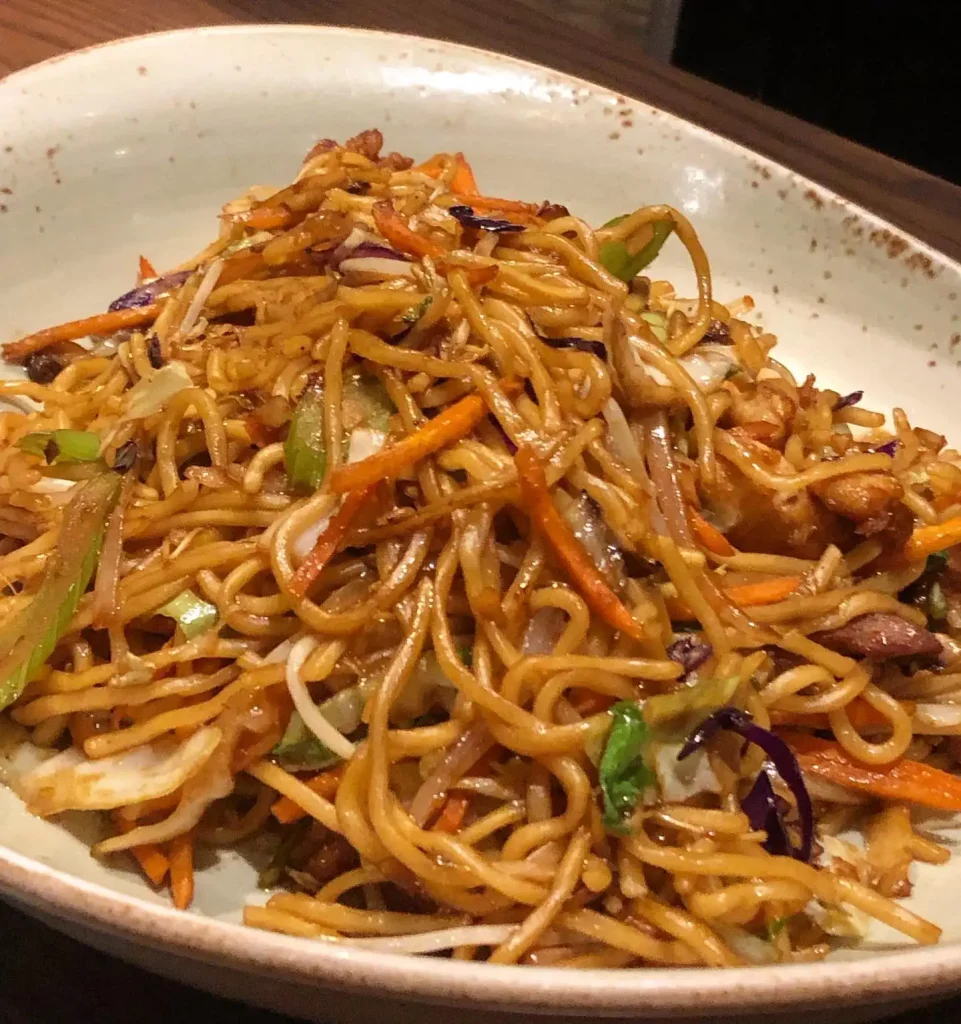 This stir-fried noodle dish is crafted with wok-seared noodles, mushrooms, celery, carrots, cabbage, and onions, all tossed in a flavorful soy-based sauce. Diners can enjoy it as a vegetarian meal or add protein such as chicken, beef, shrimp, or tofu for an even more filling experience.